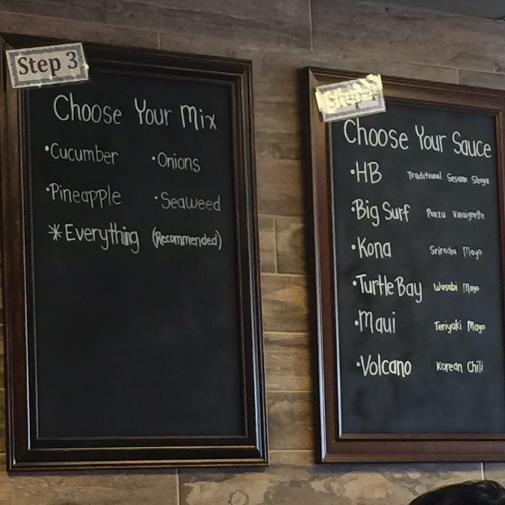 Two scoops of ahi tuna and two scoops of albacore. All Signature Bowls include: white rice, everything in the mix (cucumber, white onions, seaweed, pineapple), Ohana Sauce (HB, Kona, Volcano), crabmeat, edamame, corn, all toppings (green onions, wasabi, masago, ginger, fried onions, fried garlic), all seasonings (roasted sesame, seaweed mix, chili pepper).